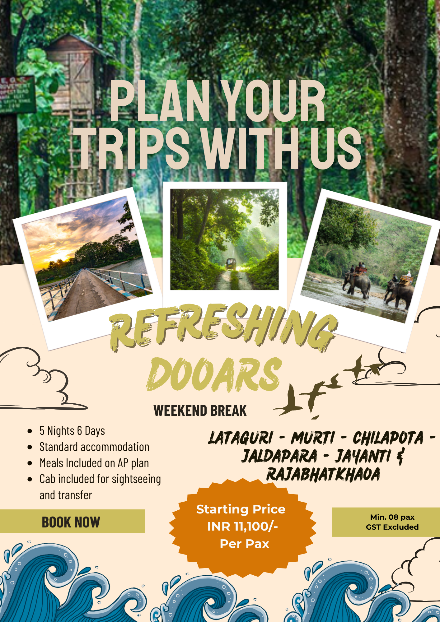 Enjoy breakfast at your hotel before departing for Jayanti, which takes around two hours. Once there, explore the tranquil Jayanti River and its scenic surroundings. Afterward, visit Rajabhatkhawa, where you can enjoy birdwatching and take in the local flora. Conclude your day by returning to your accommodation for dinner.